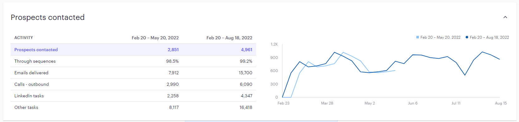 Prospects contacted helps you identify how many distinct prospects your team reached out to within the selected month. This is broken down by tactic including sequences, emails delivered, outbound calls, LinkedIn tasks, and other tasks that could fall outside sequences, such as sending an SMS. You can compare timeframes to see the change in activity for your organization as a whole, or compare specific teams and users across a single timeframe to identify trends that help you optimize performance and share best practices across teams.