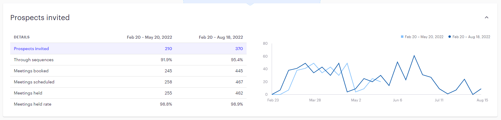 Finally, the prospects invited view helps you verify if the activities are actually leading to meetings booked and held. Many reps are measured against how many meetings are booked and held, so it is helpful for managers to see the conversion of prospects invited, responded, and booked. These can help you understand what is working within your sequences, activities, and tasks and what is truly leading to meetings on the calendar.