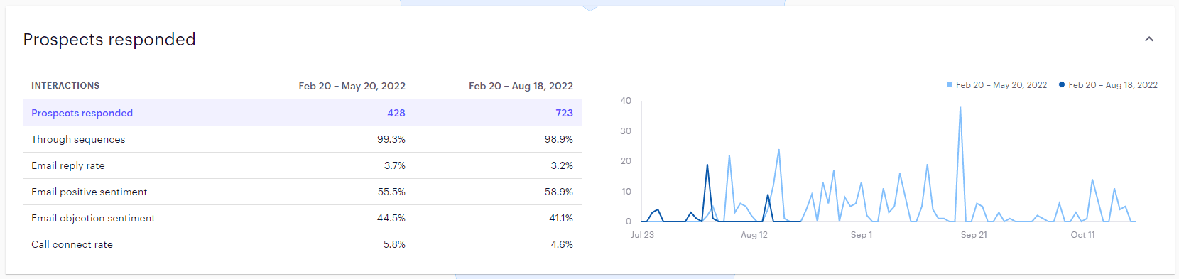 As you drill down into the prospecting activities you can see which are performing well and how changes in activity have actually translated into leads your teams can work. In this view, you are able to see the sequence and email reply rate, sentiment associated with the emails sent, and call connect rates. By drilling down into the team or user comparisons, you can find what’s working well for your teams — is it better to pick up the phone and make calls? Or are the emails within those sequences seeing more positive reply rates? If one team is seeing success in one area, you can now coach other teams to replicate winning strategies.