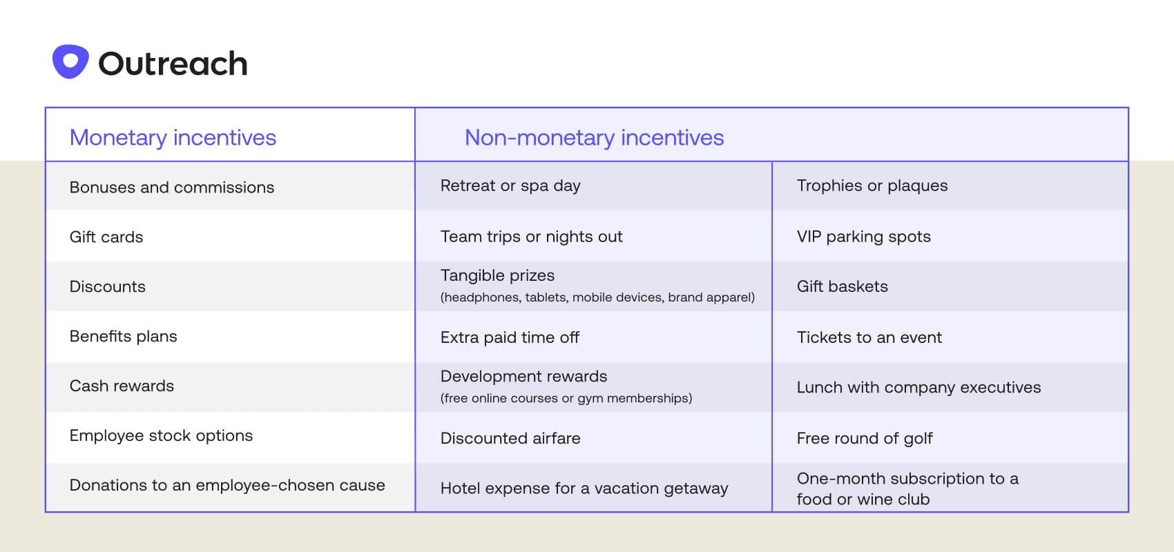 There are many ways to incentivize your sales team, and variety helps keep reps engaged, excited, and motivated to do their best. Don't be afraid to get creative with fun sales incentives! Depending on your company's salary structure, business goals, budget, and your team's preferences, your program might include monetary or non-monetary incentives.