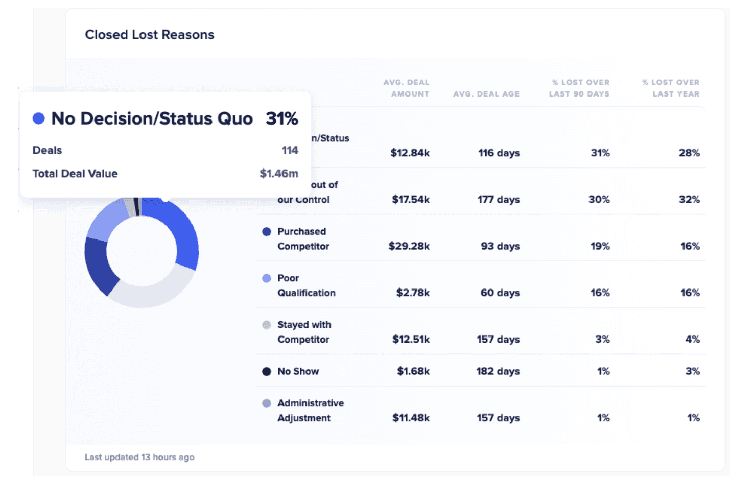 With this metric, sales teams can break down the various lost reasons within their CRM and easily analyze where things are going wrong and what the average value of those deals is. Each closed loss reason is displayed in the table on the right side, keyed by color. For each average, the platform looks at all of your team's closed loss deals within the last 12 months.