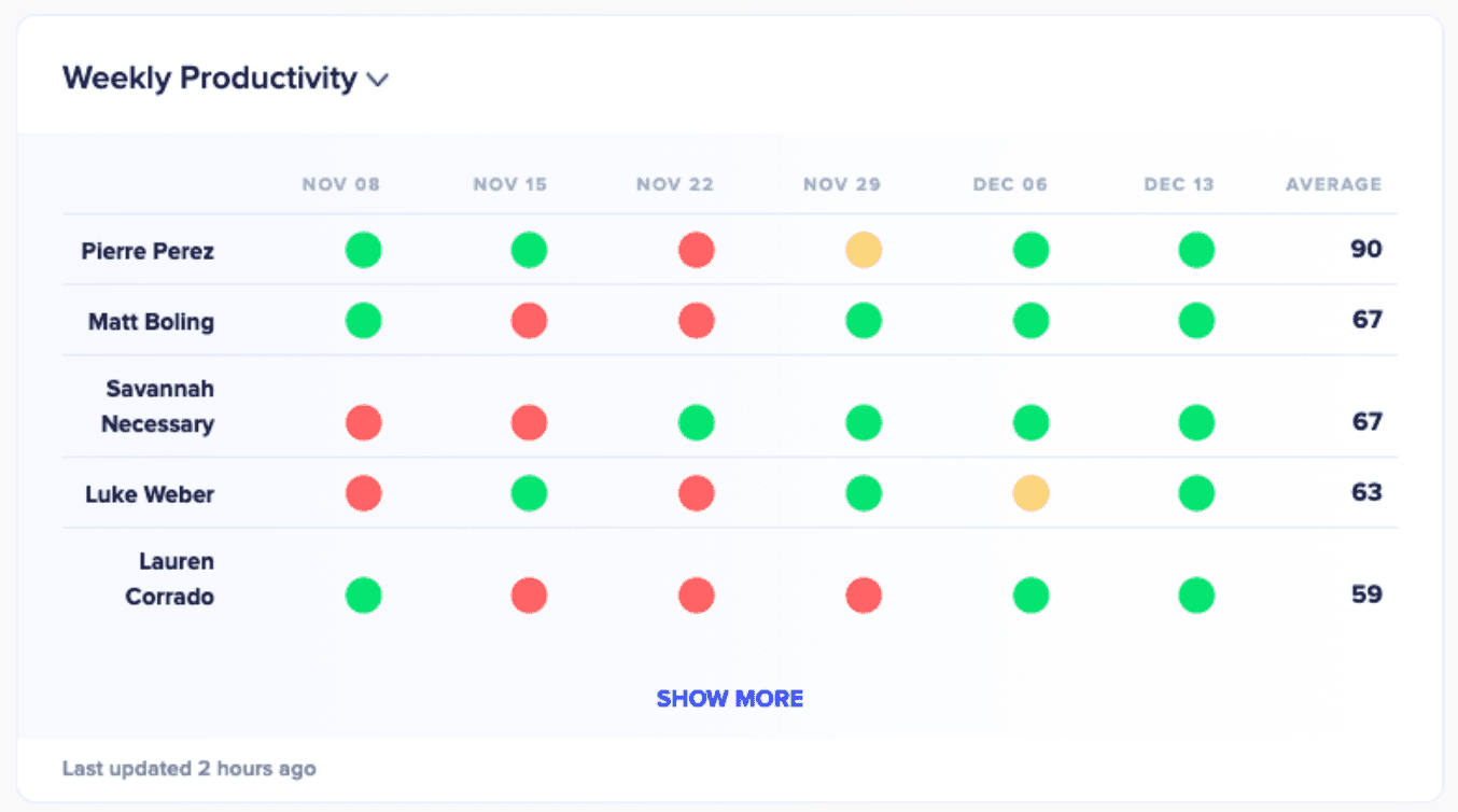 Using scorecards, managers can more accurately analyze their reps’ productivity by combining and tracking any number of variables from week to week. They can set multiple goals across those different variables and assign a weight to each goal. Once the weight has been set, the platform automatically generates a productivity score, represented here by the red, yellow, and green stoplight scorecard.
