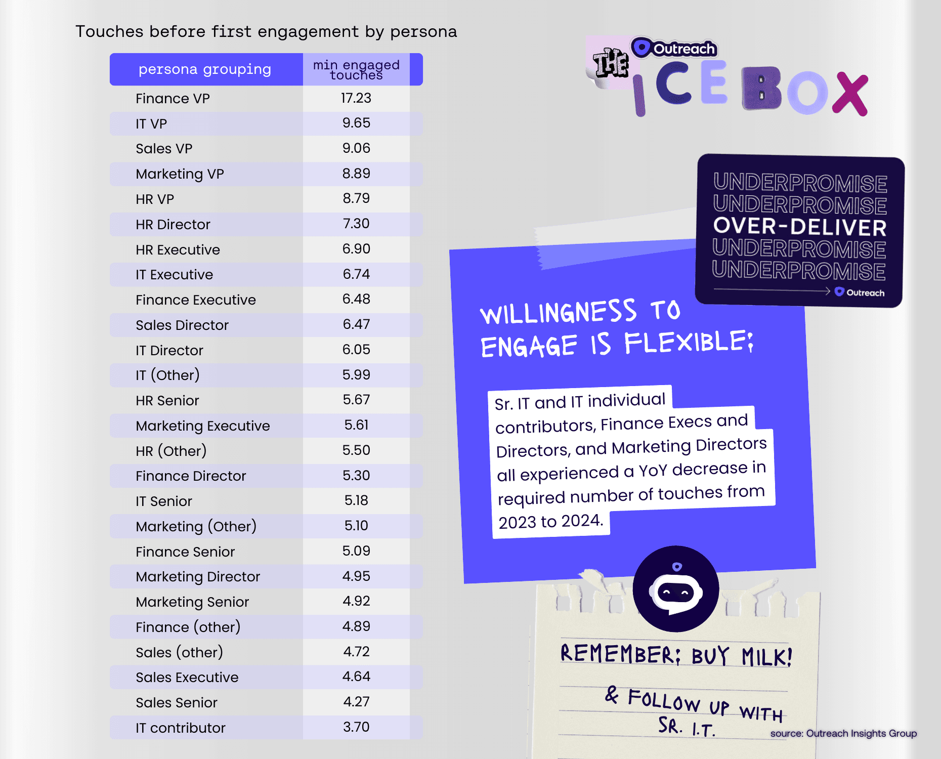 Data insights are crucial, but selling is also a deeply human act. We wanted to give you real action items to take with you that encompass the best of both worlds: Outreach’s exclusive proprietary data and a few field-tested tips and tricks from Outreach cold comm royalty.