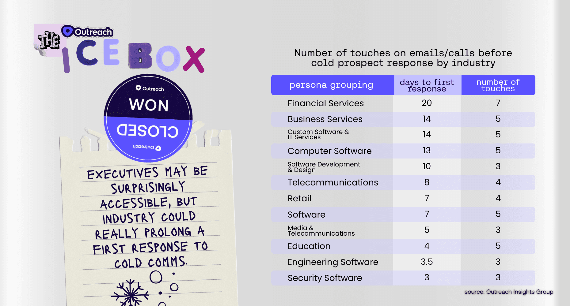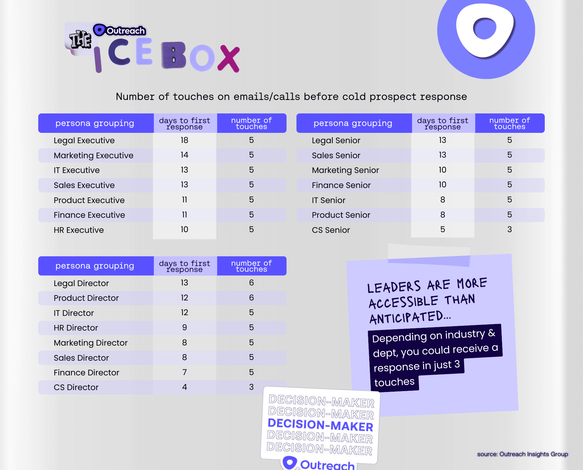We highlighted that individual contributors and leaders are responsive to cold comms because the real data surprised us. As expected, the higher up the corporate ladder, the longer you’ll typically have to wait for a prospect’s first response to cold comms, but you may be able to do so in fewer touches.