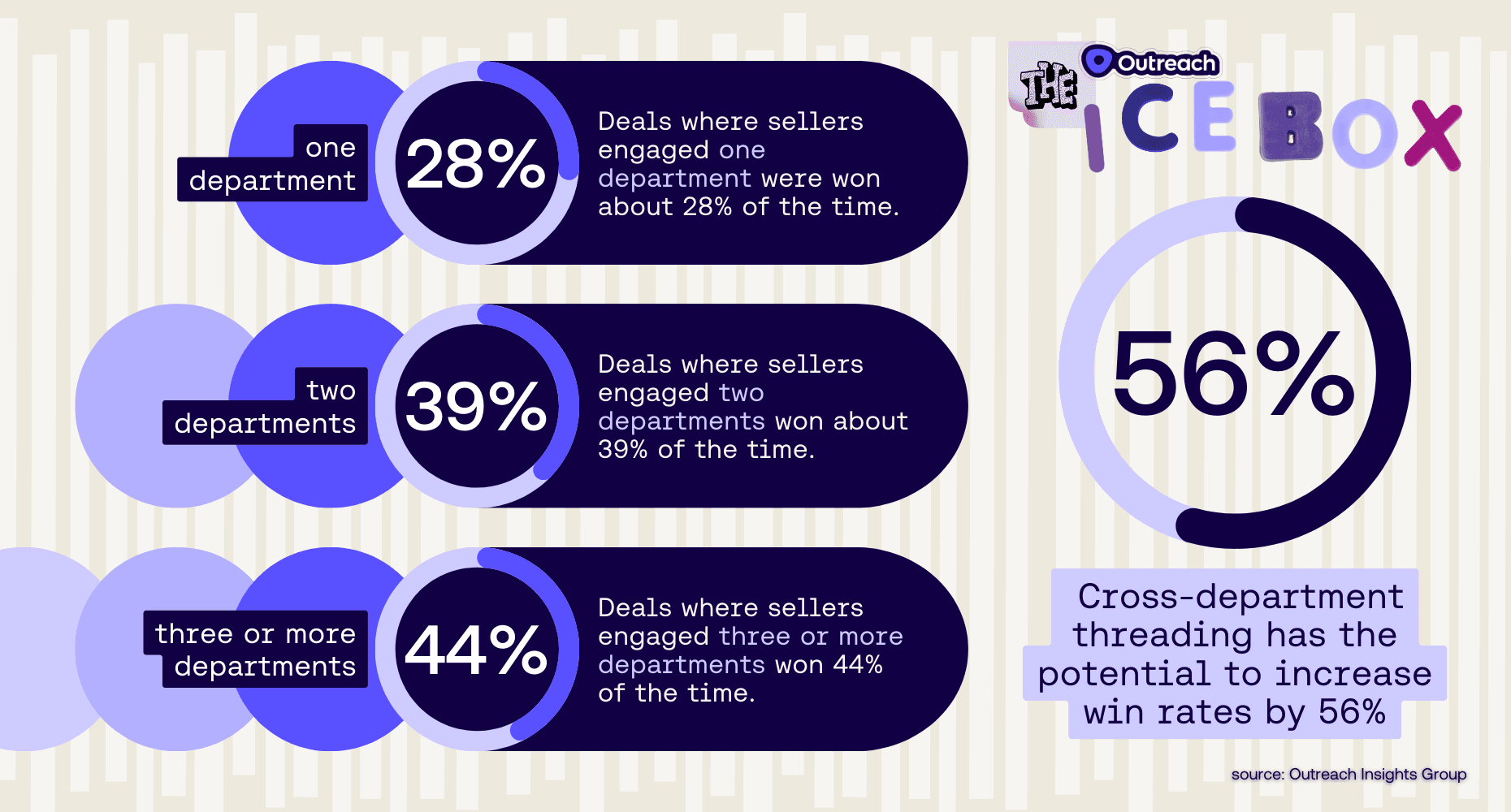 Speaking of variety, don’t forget to vary your contacts via multithreading. Use those easier-to-access higher ups to your advantage, but you should still create connections with a prospect’s team and growing buying committees. Outreach data indicates when more than one contact is engaged, deals are 37% more likely to close. But cross-department threading has the potential to increase win rates by 56%.