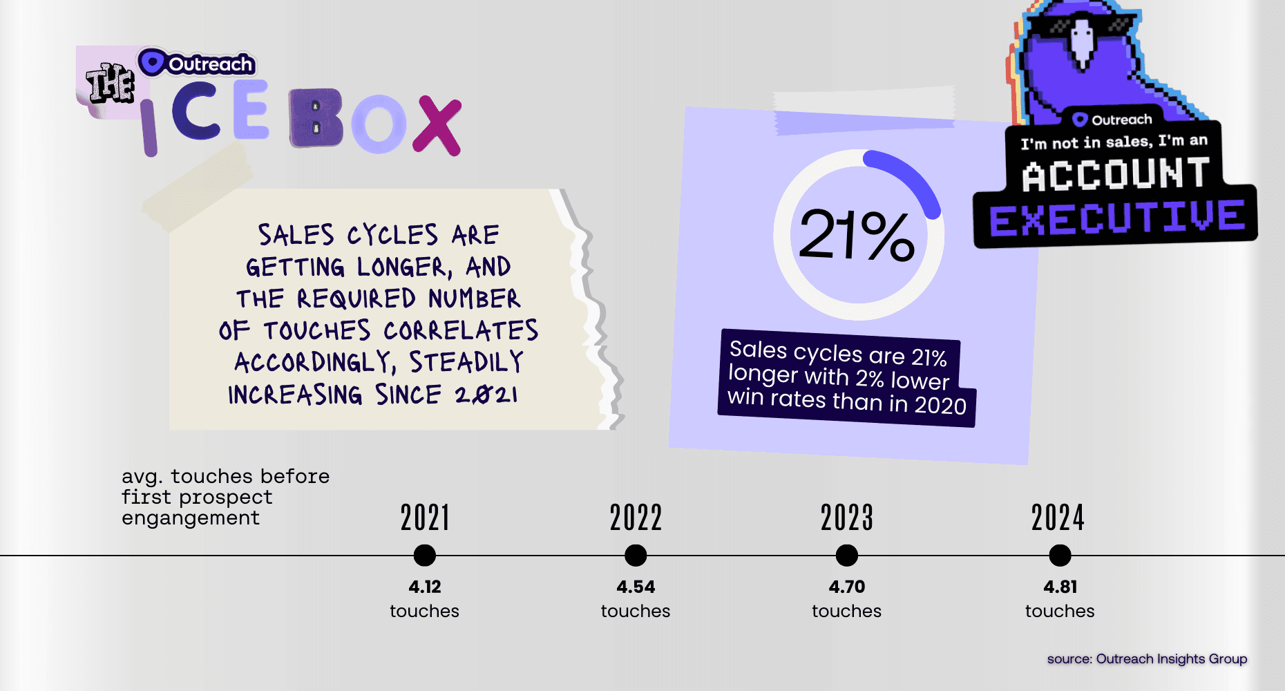 In 2023, everyone settled into this new standard, trying to make due with what they already had available (advice Outreach supports). Sales requires resilience and internal restrictions do not eradicate market conditions. In 2024, a couple more touches could be just enough to break through organic, ongoing issues and kick start a sales cycle. The official and unofficial restrictions placed on new purchases and expansions does not alleviate the real problems leaders and individual contributors need solutions for – and a little more encouragement could introduce them to your sales cycle.