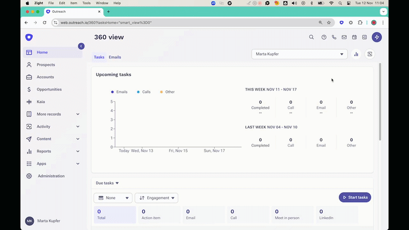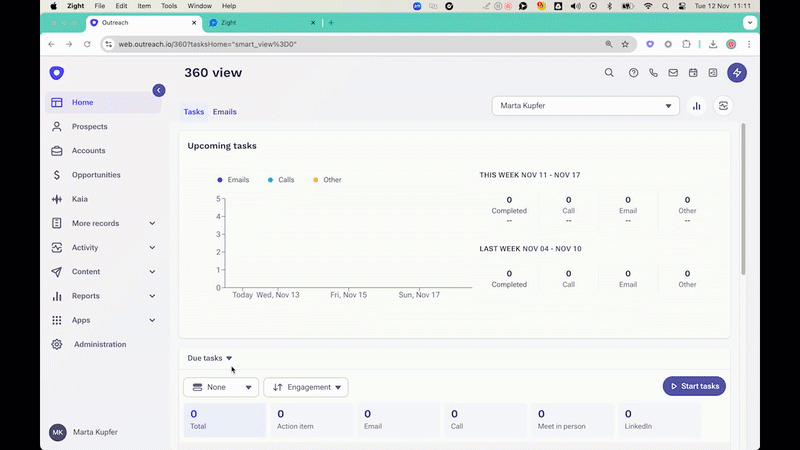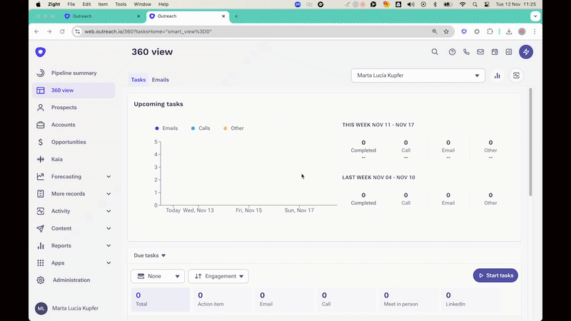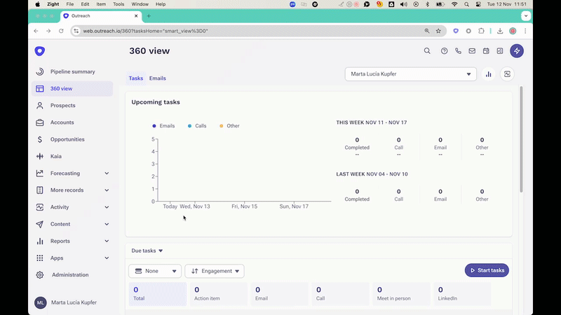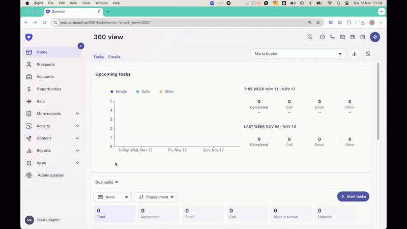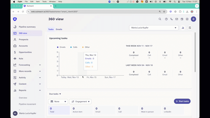 Each month, use the Activity Report to monitor activity performance and ensure reps are getting the most out of Outreach. Adherence to task execution is important as it will impact the success of a sequence and help you understand the effectiveness and impact of prospecting activity.