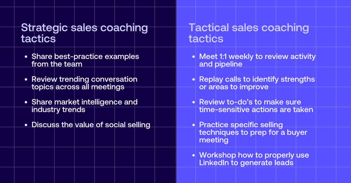 It’s individualized to your team and even down to your reps. But generally, when you think about what sales coaching looks like, it can be broken down into two categories: strategic and tactical.