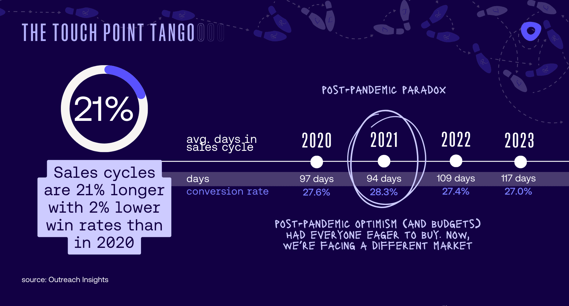 Growth-at-any-cost has shifted to a profitable growth mentality. More can say “no” and fewer are willing to say “yes,” making negotiations even longer — and we have the data to prove it. Sales cycles are 21% longer with win rates 2% lower than in 2020.