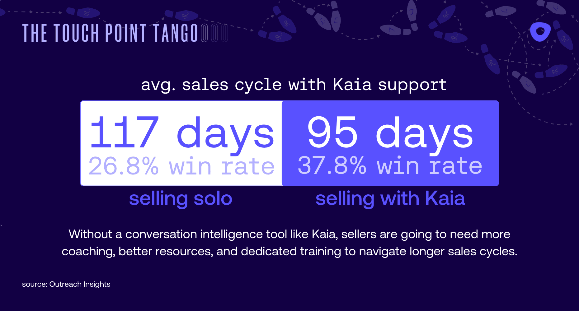 Kaia, Outreach’s conversation intelligence tool, provides real time support during phone calls and video meetings, using AI to guide the conversation and remind sellers of important information. Outreach’s data indicates that using Kaia during a call moves deals 19% faster and boosts win rates by 41%, but this isn’t just a product declaration. This is a reminder that sellers need more training and better battle cards to confront current circumstances.