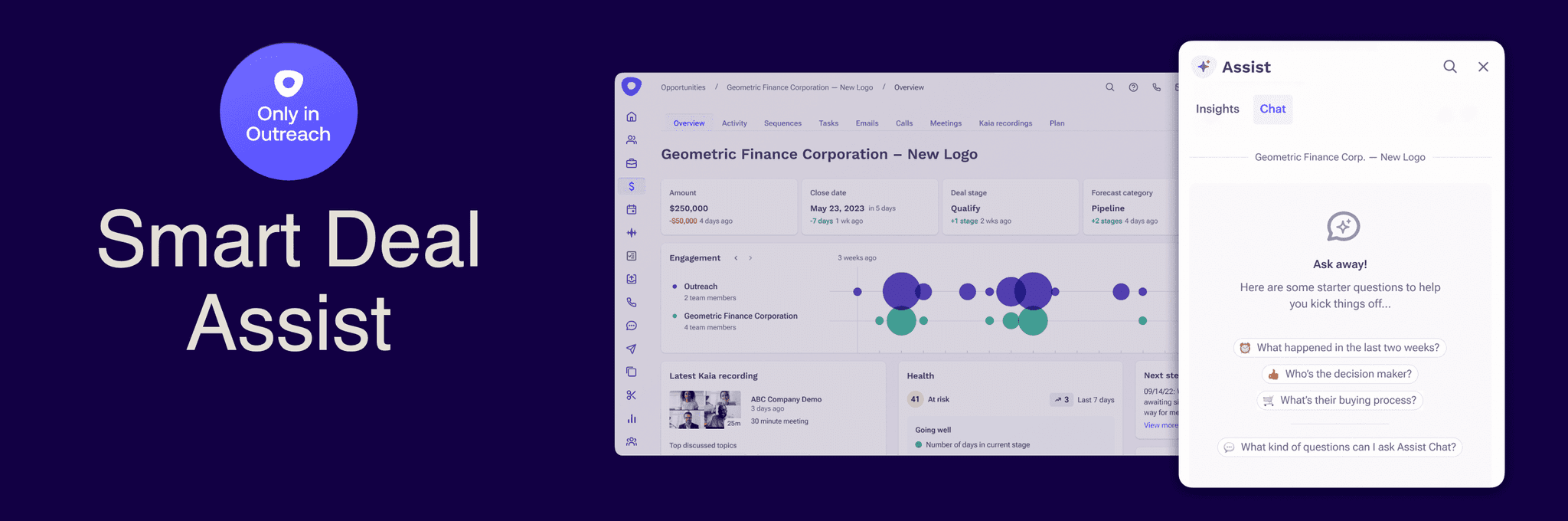 Smart Meeting Assist drives improved AI-selling precision by automatically summarizing sales meetings, answering questions about what was discussed, and capturing next steps mentioned during the call. Outreach's Kaia provides a response based on the natural flow of discussion, allowing managers and sellers to de-risk deals and plan their next steps. Responses include deep links to the relevant time points throughout the call recording so users can reference and play back key moments. The summary, questions, and answers are visible to all users with access to the call recording.