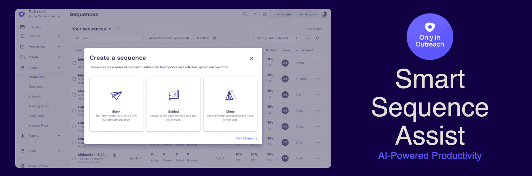 Smart Sequence Assist is a game-changing approach to creating emails, calls, tasks, and more, offering a seamless solution for both refreshing and generating new, tailored sequence content. The assist builds sequence structure and content tailored to a seller's specific goals and target persona — reducing the time and overhead needed to create sequences. By incorporating your sales goals, desired voice and tone, and leveraging Outreach's extensive knowledge from millions of successful sales engagement activities, sales teams can streamline their workflow and more effectively produce high-quality content.