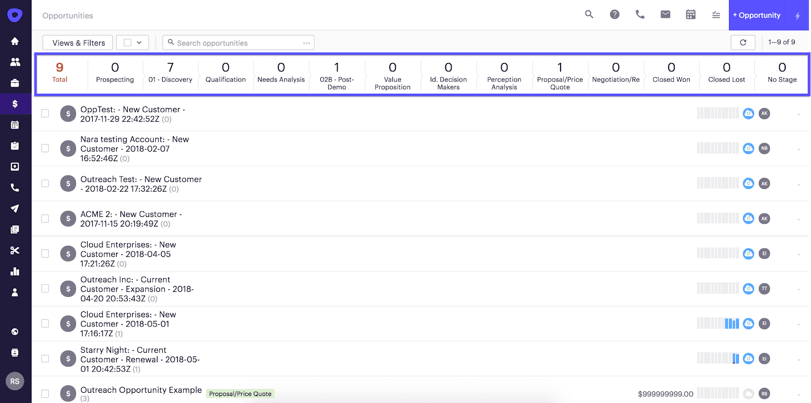 • The ability to view opportunities in Outreach provides clear visibility into your entire sales pipeline - from new business to expansion - across your entire revenue team. You can sort, filter, favorite, and create smart views of Opportunities to know which ones have been recently engaged with, which opportunities are close to closing, and which opportunities are ready to be re-engaged.