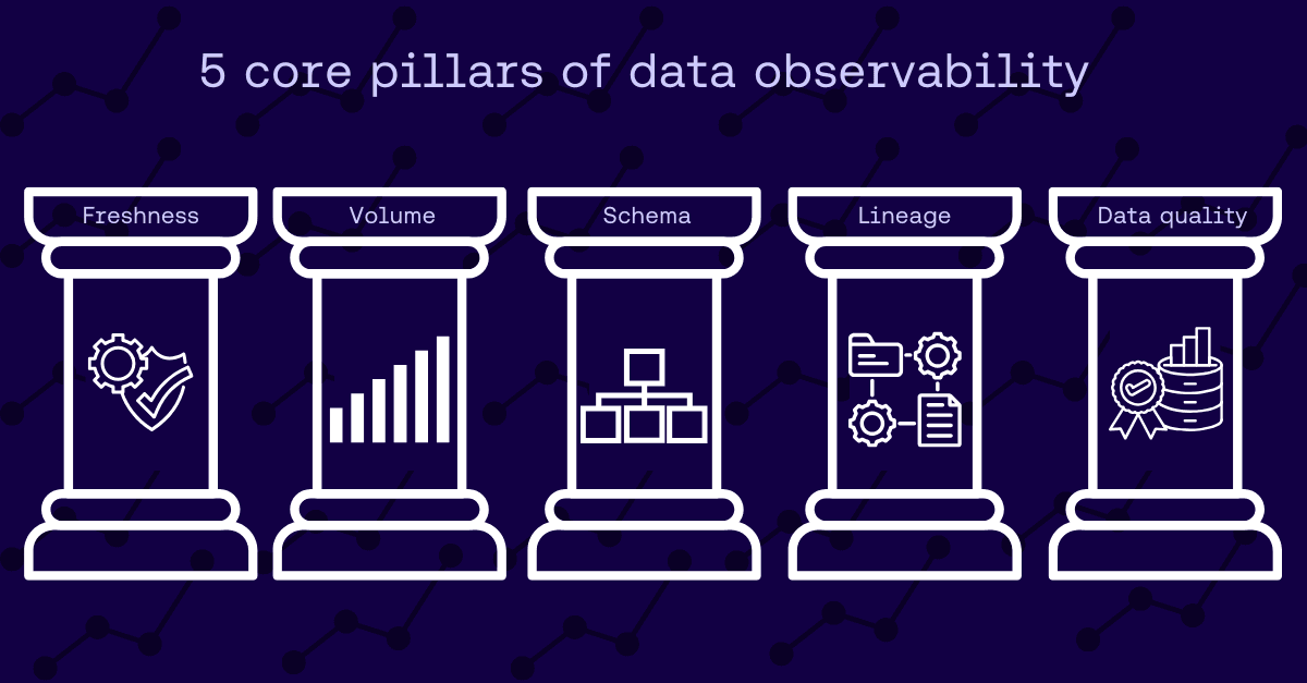To fully understand data observability, it's important to break it down into its five core pillars. Each of these plays a crucial role in ensuring data integrity and reliability.