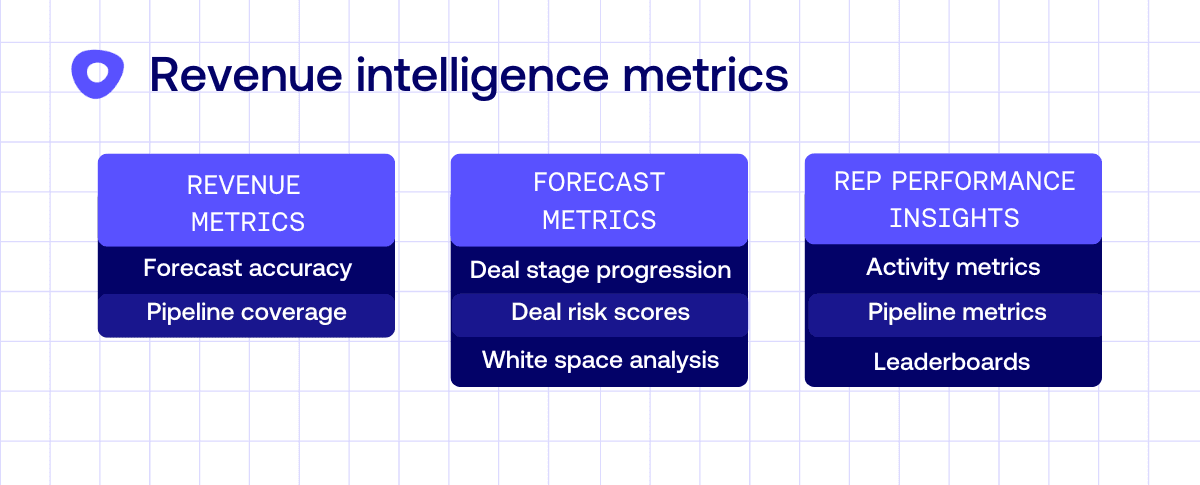 Activity metrics: These metrics include quantifiable actions taken by sales reps, such as emails sent, calls made, and meetings held, providing a foundation for evaluating rep engagement and effectiveness.