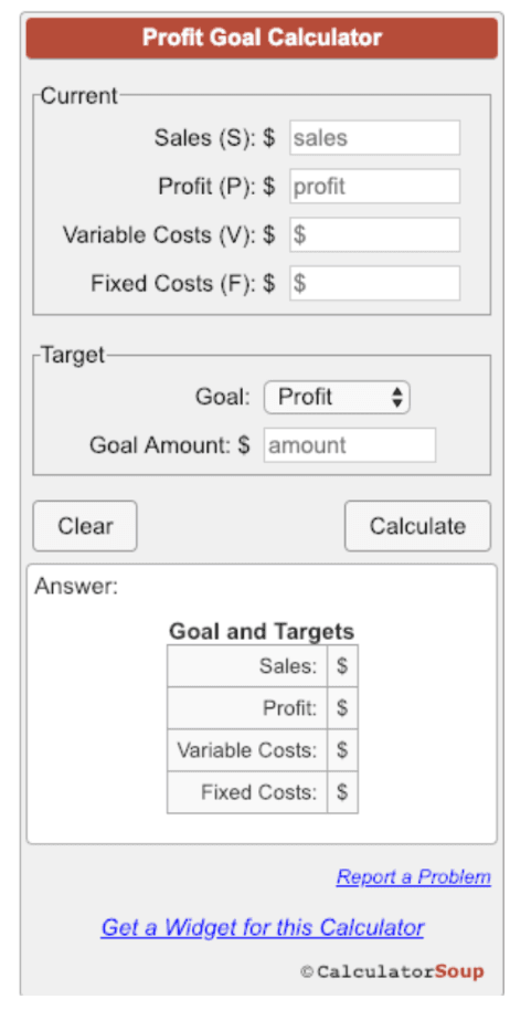 If you’re looking to set profit-based quotas, look no further. Simply plug in your team’s average monthly or quarterly profits, sales, variable costs, and fixed costs to Calculator Soup to find your ideal quota amount.