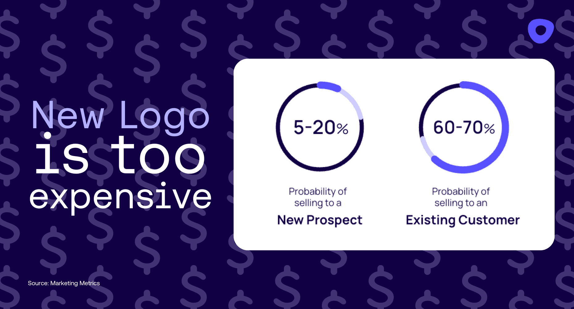 New logo has always been flashy and alluring. But when buying cycles are longer and decision-making circles have gotten bigger, Customer Acquisition Costs (CAC) have skyrocketed, increasing the appeal of signatures you already have: existing customers. New logo is too expensive, and the odds of selling to an existing customer are much higher.