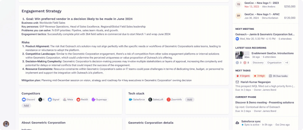 Proactively remove competitive threats and identify accounts at risk of churn or contraction. Immediately understand account health and engagement, as well as the next best action to protect renewals.